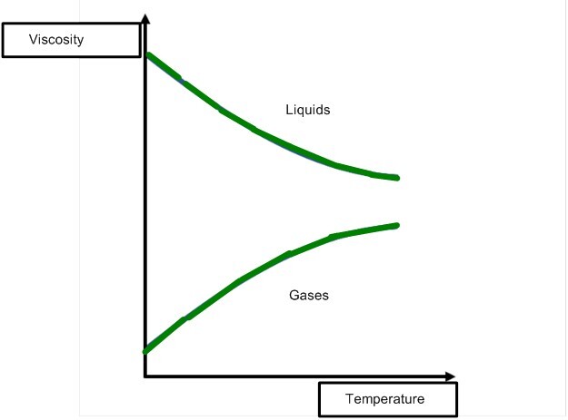 粘度與溫度的關係圖:氣體的粘度隨著溫度升高而迅速增加,液體的粘度隨著溫度升高而降低。原因是隨著粒子間分子間間隙的增大,物質更容易流動。因此,加熱液體更容易流動,而氣體流動速度更慢。