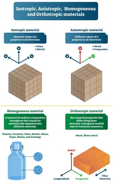 即使是塊狀材料,金屬和聚合物也都是各向同性材料。但是複合材料是各向異性材料。它們在不同方向上具有不同的特性。