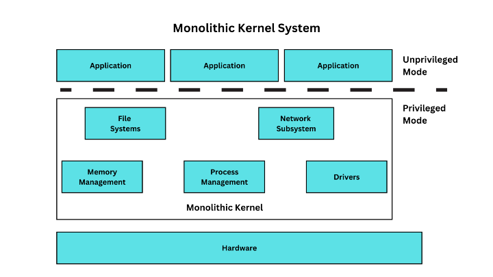 它也被稱為單核心。這種型別的作業系統被認為已經過時,並且曾經在銀行中用於諸如批處理和分時等任務。單片核心透過虛擬機器控制所有物理元件。它與微核心不同,微核心執行的功能更少,並且分為核心空間和使用者空間。