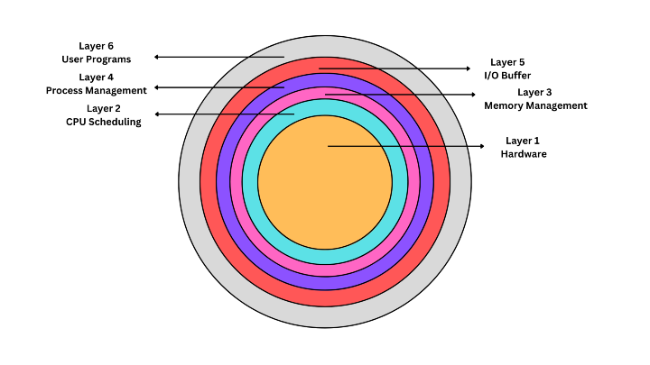 一個作業系統被組織成不同的層,每一層執行特定的功能。為了克服單片作業系統的限制,開發了分層作業系統。它旨在改進現有的設計,例如 UNIX 的單片和簡單結構(MS-DOS)。