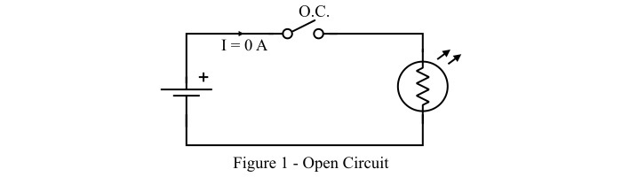 在開路中,由於電源和負載之間路徑不完整,電流無法從電源流向負載。因此,開路表示電路處於斷開狀態。開路可能是由於開關處於斷開狀態或電路中任何元件故障造成的。圖1顯示了一個簡單的開路。