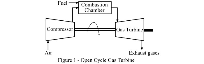 一種燃氣輪機,其中液體燃料燃燒產生的熱氣體用來旋轉渦輪機,剩餘的熱量排放到大氣中,稱為開式燃氣輪機。開式迴圈燃氣輪機的示意圖如圖 1 所示。