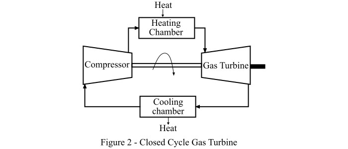 閉式燃氣輪機由壓縮機、加熱室、燃氣輪機和冷卻室組成。這種型別的燃氣輪機基於布雷頓迴圈工作。其中工作流體反覆使用,不會離開渦輪系統。