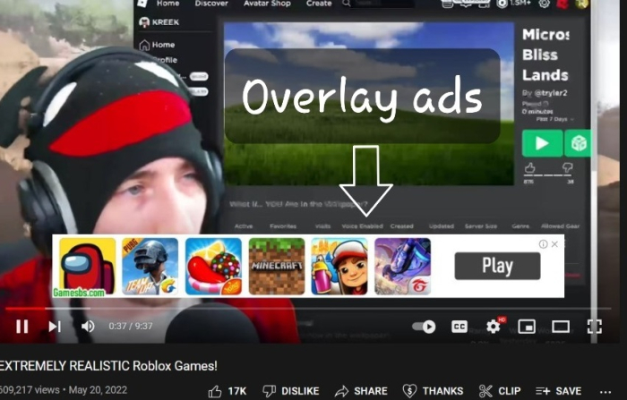 疊加廣告就像橫幅廣告,顯示在影片的底部,不會干擾觀看者的觀看體驗。這些廣告可以包含影像或文字。觀看者可以根據自己的意願與它們互動。這些影片內疊加廣告非常擅長吸引觀看者的注意力,而不會破壞使用者體驗。如今,疊加廣告設計精美、動畫效果出色,甚至具有互動性。這些廣告佔據影片視窗底部的約20%。使用者在觀看影片的同時可以看到您的廣告,他們甚至可以隨時點選右上角的“X”關閉廣告。如果他們點選您的廣告,則會跳轉到您的目標網址。只有當觀看者點選疊加廣告展開並檢視完整的廣告活動時,廣告主才需要付費。