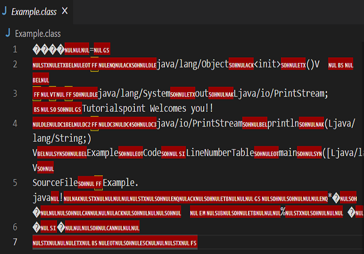 以下快照顯示了Javac編譯器生成的先前示例程式的位元組碼。