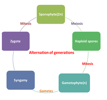 這是發生在植物和藻類中的一種獨特的生命週期。植物在多細胞二倍體階段和多細胞單倍體階段之間交替。為了有一個清晰的認識,讓我們以蕨類植物為例來理解。綠色的蕨類植物代表二倍體孢子體世代。葉片或葉子從孢子囊中發育出孢子,透過減數分裂形成。這些孢子脫落並萌發,形成單倍體雄性和雌性配子體。雄性配子體具有精子器,而雌性配子體則由頸卵器組成。精子器和頸卵器進行有絲分裂,分別產生精子和卵子。精子透過水滴攜帶到卵子處,在那裡發生受精。這導致二倍體孢子體的形成。