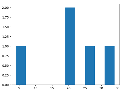 import matplotlib.pyplot as plt import pandas as pd data = {"year":[2002,2000,1999,2020,2023],"age":[19,20,34,4,25]} pandas_data = pd.DataFrame(data) print(pandas_data) plt.hist(data["age"]) plt.show()