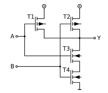 數字積體電路的功能是處理離散訊號,例如二進位制值,其中使用“真/假”邏輯運算。基本的布林函式(如與、或和非)對於構建現代數字系統的功能至關重要。這些布林函式是使用電晶體實現的。例如,以下圖所示的是與非門的內部電晶體結構。