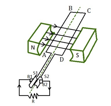 在第一個半週期中,部分 S1 接觸電刷 B1。在第二個半週期中,部分 S2 接觸電刷 B1。