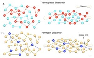 熱固性聚合物 - 這些聚合物也稱為熱固性塑膠。這些塑膠在暴露於熱量時不會熔化,並且只能成型一次。在熱固性過程中,會發生不可逆的反應(化學反應)。此類聚合物的一個例子是橡膠的硫化。熱固性塑膠被認為具有無限的分子量。
