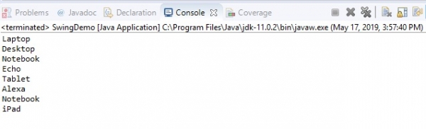 package my; import javax.swing.*; import java.awt.*; public class SwingDemo { public static void main(String args[]) { JFrame frame = new JFrame("Devices"); JTabbedPane tabbedPane = new JTabbedPane(); JTextArea text = new JTextArea(100,100); JPanel panel1, panel2, panel3, panel4, panel5, panel6, panel7, panel8; panel1 = new JPanel(); panel2 = new JPanel(); panel2.add(text); panel3 = new JPanel(); panel4 = new JPanel(); panel5 = new JPanel(); panel6 = new JPanel(); panel7 = new JPanel(); panel8 = new JPanel(); tabbedPane.setBackground(Color.blue); tabbedPane.setForeground(Color.white); tabbedPane.addTab("Laptop", panel1); tabbedPane.addTab("Desktop ", panel2); tabbedPane.addTab("Notebook", panel3); tabbedPane.addTab("Echo ", panel4); tabbedPane.addTab("Tablet", panel5); tabbedPane.addTab("Alexa ", panel6); tabbedPane.addTab("Notebook", panel7); tabbedPane.addTab("iPad", panel8); int count = tabbedPane.getTabCount(); for (int i = 0; i < count; i++) { String str = tabbedPane.getTitleAt(i); System.out.println(str); } frame.add(tabbedPane); frame.setDefaultCloseOperation(JFrame.EXIT_ON_CLOSE); frame.setSize(600,350); frame.setVisible(true); } }