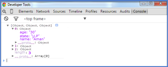 使用 console.log() 方法很難讀取資料。console.log() 方法將在控制檯樹中顯示陣列,如下圖所示: