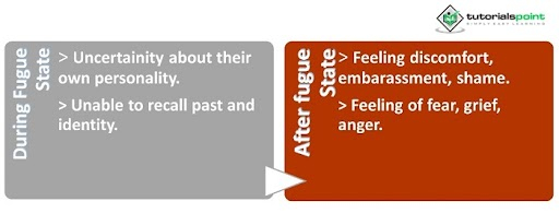 - 個體突然並且看似有意地離開他們的家、工作場所或親密關係,持續幾天或幾周,或者漫無目的地四處遊蕩。遺忘症通常與對自身身份的困惑以及新身份的表現有關。在逃亡期間