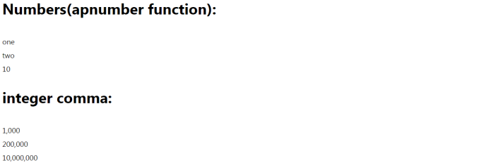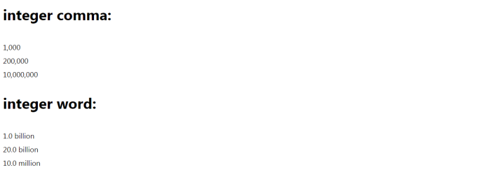 </html>**apnumber** 用於將數字轉換為文字,**intcoma** 用於在數字之間新增逗號,**intword** 用於將整數轉換為百萬或十億。