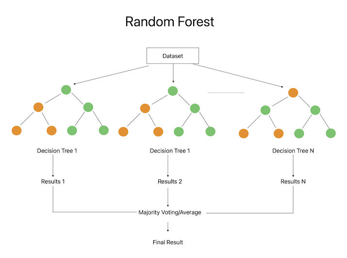 被稱為隨機森林的整合學習方法使用許多決策樹來提高模型的效能。每棵決策樹都使用不同的特徵和資料子集進行訓練。最終預測是透過平均每棵樹提供的預測來計算的。