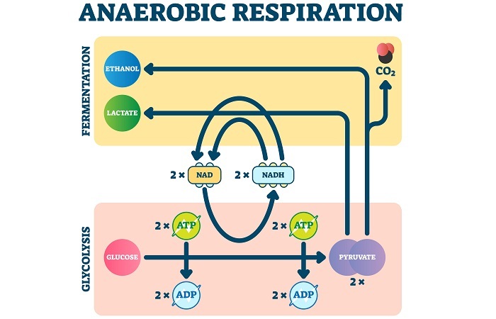 無氧呼吸在缺氧條件下發生,效率低於有氧呼吸。此過程包括將葡萄糖分解成乳酸或酒精和二氧化碳,並以ATP的形式釋放少量能量。無氧呼吸的化學方程式為: