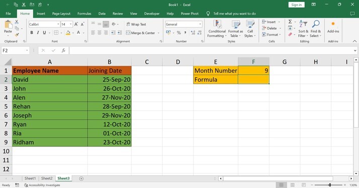 員工姓名突出顯示在第一列中,日期數顯示在第二列中。現在,我們必須計算特定月份發生的日期數。請考慮以下所示的示例資料 -