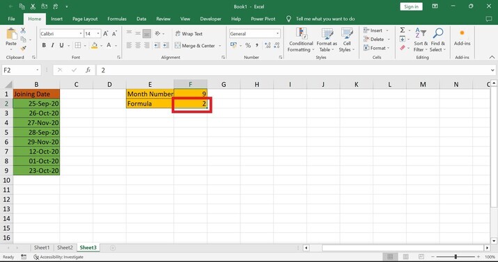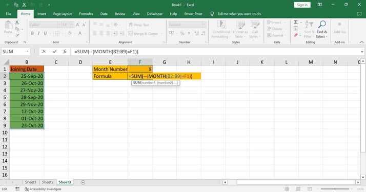 步驟 3 - 然後按Ctrl+Shift+Enter鍵計算陣列公式。結果數字為 2,這意味著 B 列中只有兩個 9 月份的日期。