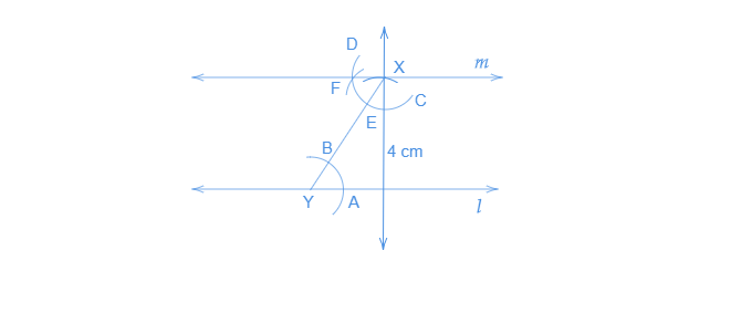 畫一條直線 l。在 l 上任意一點作 l 的垂線。在這條垂線上選擇一點 X,使其距離 l 為 4 釐米。過 X 作一條與 l 平行的直線 m。