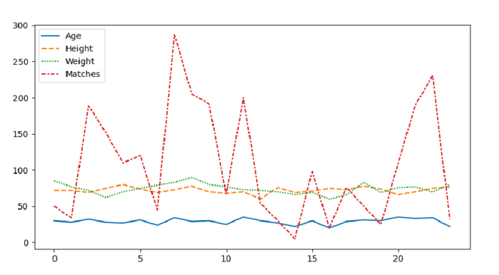 dataFrame = pd.read_csv("C:\Users\amit_\Desktop\Cricketers2.csv")使用整個資料集繪製線圖:
