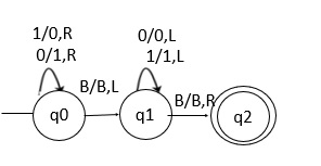 q0狀態將'1'替換為'0',將'0'替換為'1',並向右移動;當遇到空白時,向左移動。