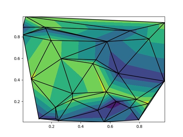 import numpy as np import matplotlib.pyplot as plt import matplotlib.tri as mtri # for generating random points ranpoints = 30 x = np.random.rand(ranpoints) y = np.random.rand(ranpoints) tri = mtri.Triangulation(x, y) # Generate random values to color the triangles values = np.random.rand(ranpoints) # Plot the triangular grid plt.tricontourf(tri, values) plt.triplot(tri, marker='2', markersize=3, linestyle='-', color='k') plt.show()