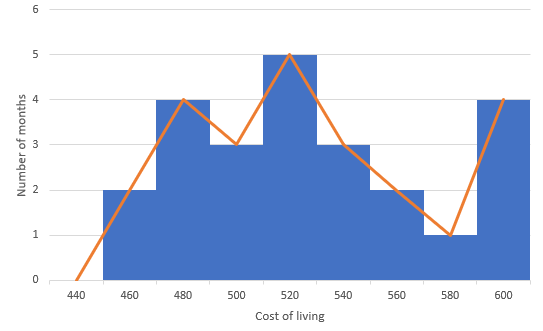 在同一張圖中,繪製直方圖和頻數多邊形來表示以下資料,這些資料顯示了某個城市兩年內的月度生活成本指數