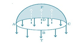 讓我們假設一個半徑為 r 的液滴。由於表面張力,表面分子會受到合向內的力。內部壓力大於外部壓力。存在由過壓形成的等效向外力,以平衡由於表面張力引起的向內力。