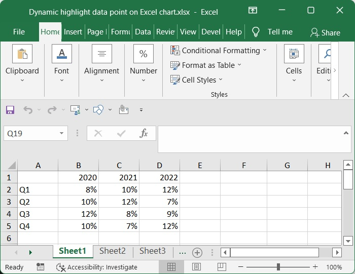 獲取並整理必要的資料。出於本圖的目的,我擁有從 2020 年到 2022 年每年季度收入的百分比增長。