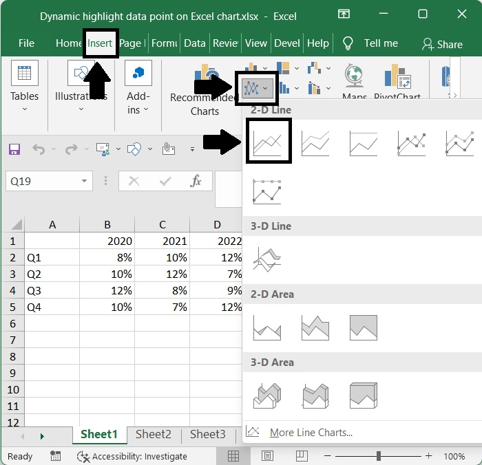 在確保突出顯示完整的資料集後,轉到插入 → 圖表 → 帶標記的折線圖。這將導致新增一個折線圖,該圖表為每一年都有三條不同的線。