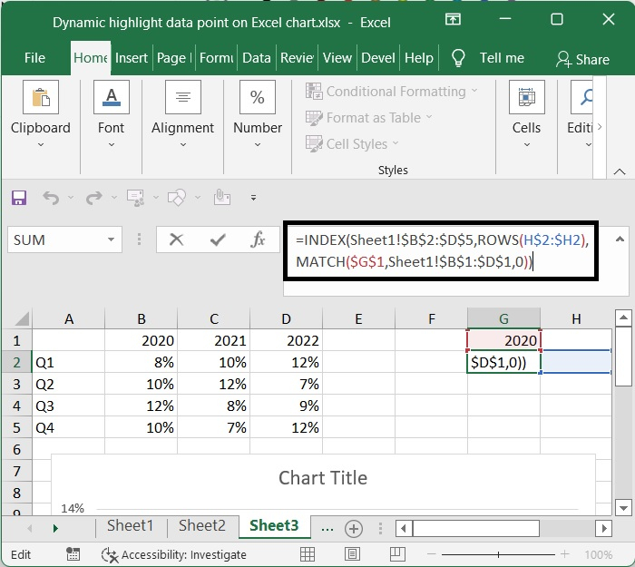 之後,將其中一個序列的名稱插入到當前為空的欄位中。例如,如果單元格 G1 包含年份 2020,則單元格 G2 應包含以下公式: