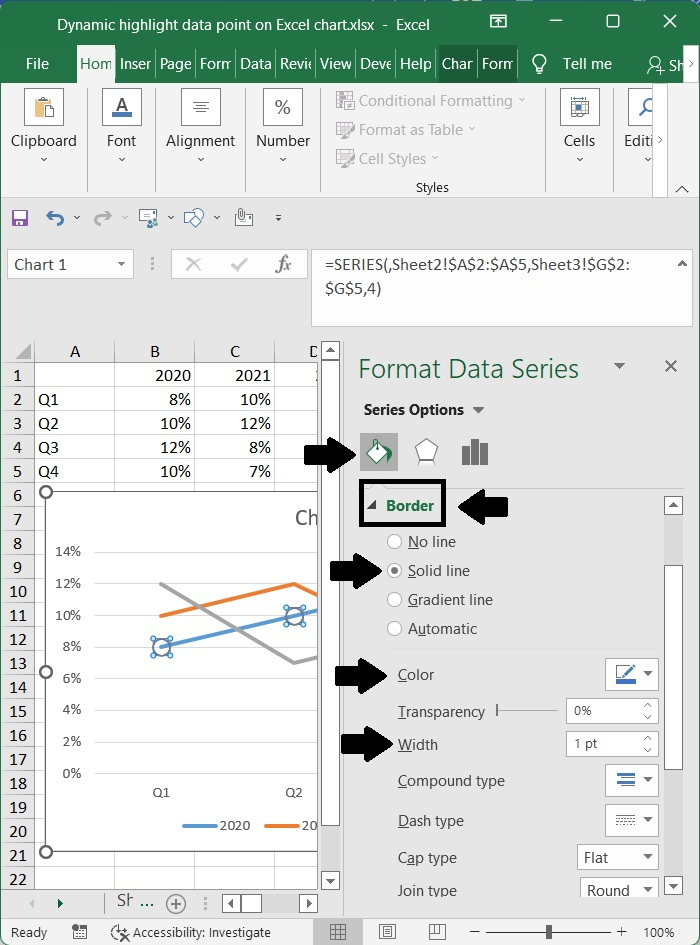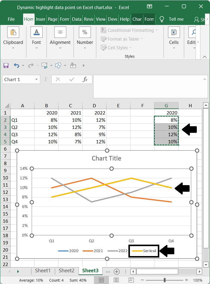 選擇包含公式的單元格 (G2:G5),然後使用 Ctrl + C 複製它們。接下來,選擇圖表,然後按 Ctrl + V 貼上複製的公式。最後,請注意哪個序列 (series4) 導致顏色更改。