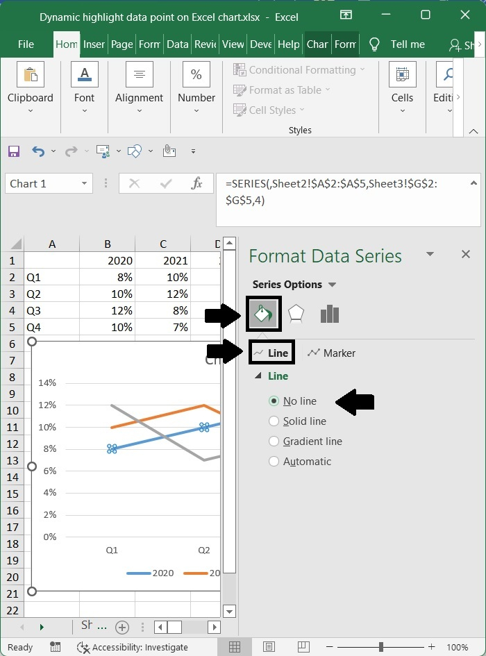 在設定資料系列格式視窗中,選擇填充和線條選項卡,然後選中線條部分中無線條選項旁邊的框。
