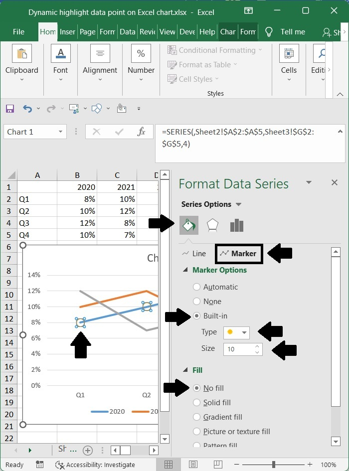 轉到標記部分,然後選擇內建選項,然後從型別下拉列表中選擇圓形標記。接下來,將大小增加到 10,最後選中填充組中的無填充框。