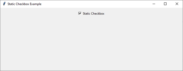 import tkinter as tk def on_checkbox_change(): print("Checkbox is checked" if checkbox_var.get() else "Checkbox is unchecked") # Create the main window root = tk.Tk() root.title("Static Checkbox Example") root.geometry("720x250") # Create a static checkbox checkbox_var = tk.BooleanVar() checkbox = tk.Checkbutton( root, text="Static Checkbox", variable=checkbox_var, command=on_checkbox_change) checkbox.pack(pady=10) # Start the Tkinter event loop root.mainloop()
