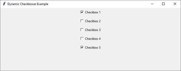 import tkinter as tk def on_checkbox_change(checkbox_value, variable): print(f"Checkbox {checkbox_value} is {'checked' if variable.get() else 'unchecked'}") def add_checkboxes(): for i in range(5): checkbox_value = f"Checkbox {i + 1}" checkbox_var = tk.BooleanVar() checkbox_var.set(False) # Set the initial state (unchecked) checkbox = tk.Checkbutton( root, text=checkbox_value, variable=checkbox_var, command=lambda v=checkbox_value: on_checkbox_change(v, checkbox_var)) checkbox.pack(pady=5) # Create the main window root = tk.Tk() root.title("Dynamic Checkboxes Example") root.geometry("720x250") # Add checkboxes dynamically add_checkboxes() # Start the Tkinter event loop root.mainloop()