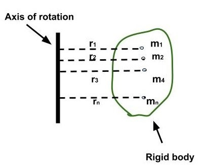 讓我們考慮一個由 n 個粒子組成的剛體,其質量為$\mathrm{m_1,m_2,m_3............................m_n}$,繞固定軸旋轉。設$\mathrm{r_1,r_2,r_3...........................r_n}$分別是粒子的位置。