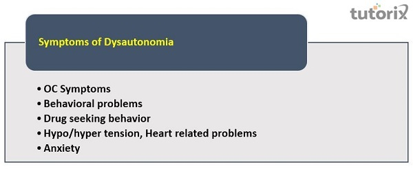 FD患者可能會經歷一系列行為問題。可能會出現精神病。在高血壓-嘔吐危象期間,護理人員通常報告看到患者變得退縮或激動。尋求藥物的行為加上苯二氮卓類藥物成癮是一個經常被忽視的精神症狀。關於原發性和繼發性自主神經疾病的研究經常提到體位性不耐受的症狀。體位性不耐受症狀通常表明控制腦血流的依賴ANS的神經過程失調的開始。