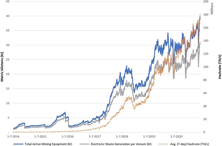圖 2:自 2014 年 7 月以來,比特幣網路中估計的活躍採礦裝置和電子垃圾產生量(以公噸計算)。