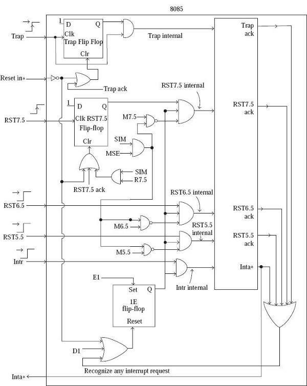 在 8085 中,有一個稱為 IE 觸發器的觸發器。這裡 IE 代表中斷使能。只要此觸發器復位到 0 狀態,8085 中斷系統就會被停用。也就是說,即使外部中斷引腳被啟用,相應的內部中斷訊號也不會被啟用。這可以在下圖中觀察到,該圖提供了 8085 中斷結構的內部架構。