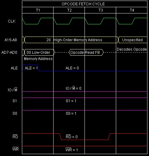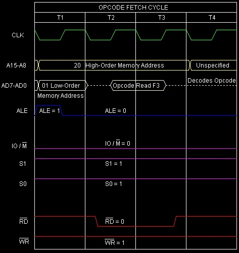 **總結** - 因此,此指令 DI 需要 1 位元組、1 個機器週期(操作碼獲取)和 4 個 T 狀態才能執行,如時序圖所示。
