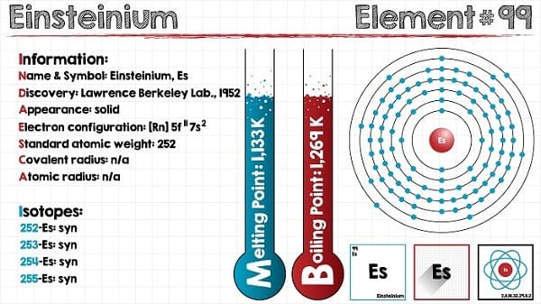 通常,元素的原子序數指定它包含多少個質子。原子序數表示質子的數量,用於識別元素。鐒元素的原子序數為 99。原子中的電子在各種殼層上圍繞原子核執行。元素的電子構型定義為其每個殼層中電子的數量。鐒的電子構型為 [Rn] 5f117s2。鐒每層電子的更簡單表示方式為 2、8、18、32、29、8、22、8、18、32、8、2。鐒的化合價可以從 +2 到 +3 到 +4 不等。
