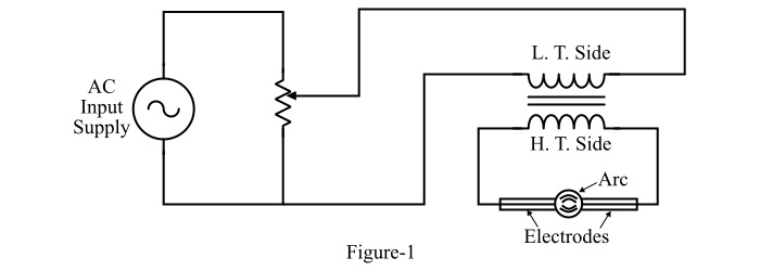 在高壓擊弧法中,在一對導電電極之間保持恆定的空氣間隙。電極連線到升壓變壓器的高壓次級繞組,變壓器的初級繞組由可變交流電源供電,如圖 1 所示。