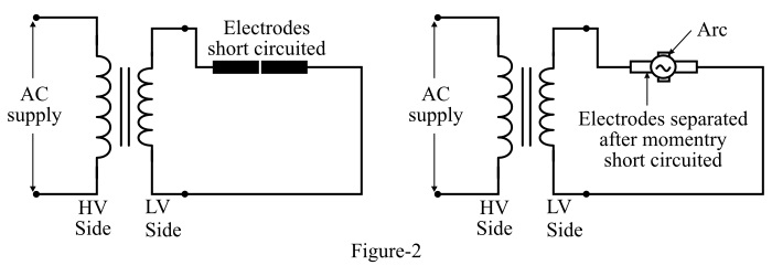 圖 2 顯示了低壓擊弧法的電路圖。在這種方法中,大約供應電壓的低電壓足以在電極之間產生電弧。在這種方法中,兩個導電電極連線到降壓變壓器的低壓次級繞組。這些電極被短暫短路,然後立即分離,從而產生電弧。
