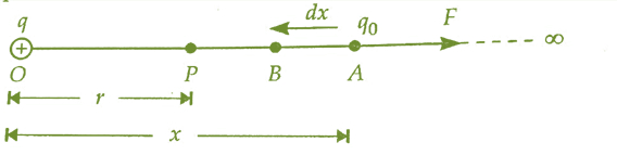 這裡,一個正電荷q位於點O。現在,我們將計算距離O點r距離處的點P處的電勢。根據定義,電勢等於我們將一個單位正電荷從無限遠處移動到我們所考慮的點P所做的功。