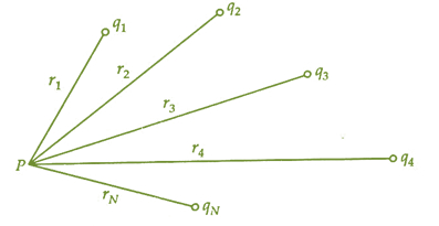 $$\mathrm{V_{1}=\frac{1}{4\pi \epsilon _{0}}.\frac{q_{1}}{r_{1}},V_{2}=\frac{1}{4\pi \epsilon _{0}}.\frac{q_{2}}{r_{2}},V_{3}=\frac{1}{4\pi \epsilon _{0}}.\frac{q_{3}}{r_{3}}............V_{N}=\frac{1}{4\pi \epsilon _{0}}.\frac{q_{N}}{r_{N}}}$$