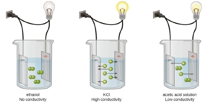 可以透過在溶液中放置電極並施加電壓來確定溶解離子的相對濃度。這可以透過測量電流來定量進行,也可以透過觀察電路中燈泡的亮度來定性進行。