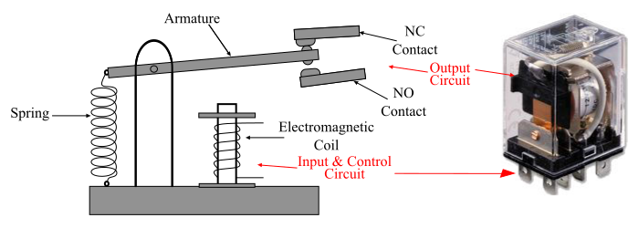 輸入部分包含輸入端子,需要在該端子上施加小的控制訊號。控制部分有一個電磁線圈,當控制輸入訊號施加到輸入端子時,該線圈將通電,而輸出部分則由一個可動銜鐵和機械觸點(動觸點和靜觸點)組成,銜鐵的運動使電路通斷。