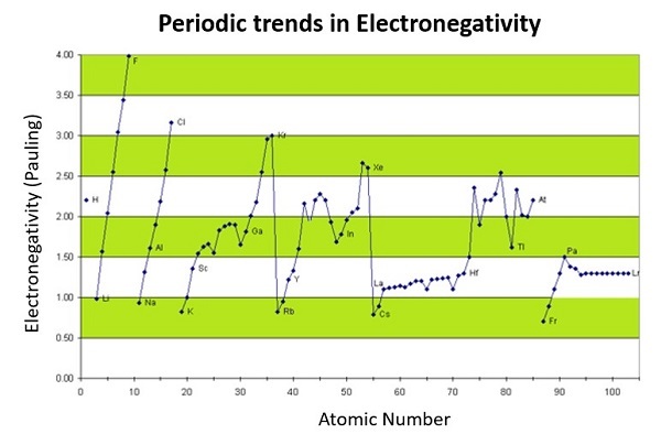 電負性是指原子在共價化學鍵中吸引共享電子的能力。電負性在週期表中從左到右增加,從上到下減小。兩種結合原子之間的電負性差異將決定形成的鍵的型別。
