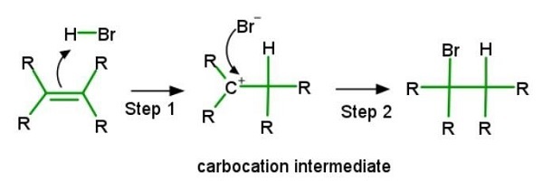 可以使用溴化氫觀察親電過程。在碳正離子反應期間,溴化氫靶向碳-碳雙鍵(C=C)。它產生帶正電荷的H+。由於仲碳正離子比伯碳正離子穩定得多,因此溴離子靶向碳正離子原子,導致烷基鹵化物的形成。